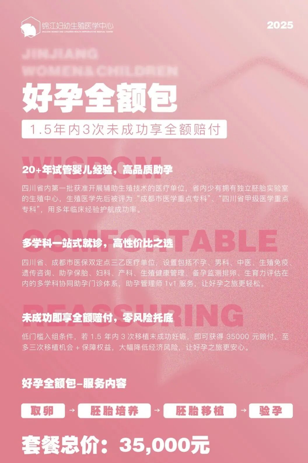 该套餐入组条件低,仅需3.5万元即可包含取卵、胚胎培养、移植、验孕等费用,若 1.5 年内3次移植未成功妊娠,即可获得赔付3.5万元。